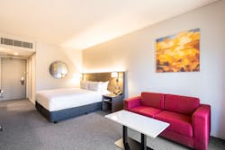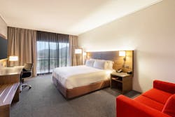 Designed for comfort and convenience, our newly refurbished king guest room offers the space and privacy you need to work or relax. Unwind on the signature Sweet Dreams by DoubleTree king bed while you enjoy your favourite program on our 55" smart TV. Stay in touch with high-speed internet access or soak up the outback Australian sunshine from your private balcony overlooking the landscaped gardens. A twin guest room is also available.