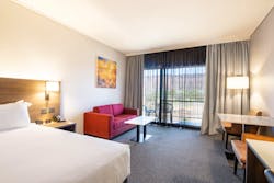 This newly renovated suite gives you the space and privacy you need for work or to unwind. The bedroom features a king bed and one large desk with high-speed internet access. Enjoy the extra space with a separate living room and extended balcony to enjoy the panoramic Australian outback view of the famous MacDonnell Ranges.