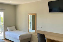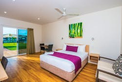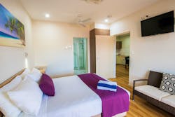 Perfect for a couple or small family including a queen & single bed. This spacious air-conditioned room, also with fans, features a sliding door opening onto either a large balcony or patio.