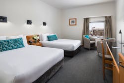 The Twin Queen Room spacious and comfortable at 35sqm featuring city views, 2 queen beds, LCD TV, work desk, free WIFI and mini fridge, tea and coffee facilities, luxury amenities, iron set, in-room safe, hair-dryer, and pay-per-view in-room movies. The Twin Queen Room comfortably sleeps up to 3 adults or 2 adults and 2 children in existing bedding.