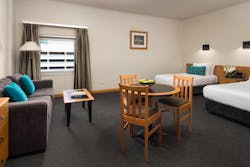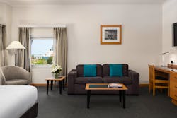 The Junior Suite is large and spacious at 42sqm, well furnished and includes a kitchenette for those wishing to do some basic cooking. These executive corner rooms feature a king bed, LCD TV, in-room safe, luxury bathroom amenities, tea & coffee facilities, iron set, Lounge, work desk, free WIFI and mini fridge. The lounge can convert to a sofa bed, if required. This room is ideal for the single traveller or couple but can sleep up to 3 adults or 2 adults and 2 children in existing bedding.