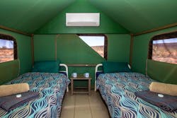 Vor der Kulisse der George Gill Range bieten die einzigartigen Buschzelte komfortable Unterkünfte mit Zugang zu Gemeinschaftseinrichtungen. Jedes Zelt hat zwei Einzelbetten, Beleuchtung und Strom. Die Campküche steht allen Gästen zur Verfügung und verfügt über einen Kühlschrank, eine Spüle und eine Mikrowelle. Es gibt ein Lagerfeuer für Gäste, die in den Buschzelten übernachten. Brennholz wird nicht geliefert.