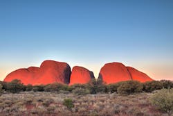 his tour takes you to the inspiring red-hued sedimentary rock domes of Kata Tjuta to watch the sunset. They are thought to have originally been one huge piece of rock, much like Uluru, that has weathered over millions of years to become an intriguing series of individual formations. As evening approaches, each passing minute brings something new as the domes continue to change colour with the setting sun.