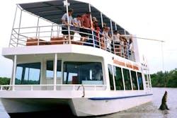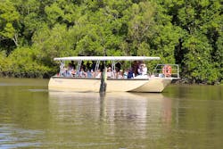 エアコンと大きな窓を備えたオリジナルのアデレード川クイーン ジャンピング クロコダイル クルーズ。