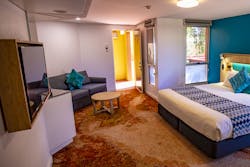 客室には自然光が入る専用バスルーム、独立したシャワーとトイレが備わっています。さらに、オープンプランの洗面化粧台、室内無料 Wi-Fi、無料放送チャンネル付きテレビ、小型冷蔵庫が備わっています。