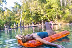 The afternoon is spent exploring Berry Springs Nature Park, This fresh water swimming hole is known for its pristine, crystal-clear waters and serene environment, and is the perfect place to unwind and cool off. Float down the magic carpet ride of pandanus palms, or relax in one of the natural spas, or just float around on a pool noodle and enjoy the beauty of the lush tropical vegetation in this idyllic oasis.