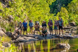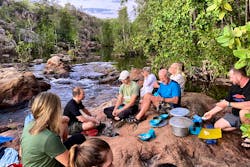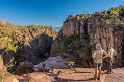 The trail follows parts of an ancient Jawoyn song line through the Nitmiluk National Park. The Jatbula Trail takes you up onto the Arnhem Land Escarpment, through shady monsoon forests, past spectacular waterfalls and their crystal clear swimming pools and introduces you to stunning Jawoyn Aboriginal rock art sites. They camp in some of the most amazing wilderness country in Australia.