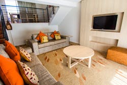 This split level apartment configuration fits up to six people using the existing bedding. The room features a queen bed in the main bedroom, one king zipper in the second bedroom (can be set up as two singles on request), a sofa bed (single), and a Murphy bed in the living room.
