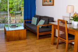 The room includes all your basic necessities, including an ensuite bathroom with shower and complimentary toiletries, tea/coffee-making facilities, mini-fridge, flat screen TV, dining table with chairs, ceiling fan and air-conditioning.