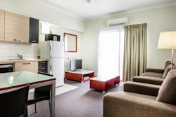 The two bedroom suites have a separate sitting area with two lounge sofas, a four seater dining table and chairs, limited kitchenette facilities for self-catering. The master bedroom consists of a king size bed, with two king singles beds in the second bedroom. The private ensuite is two-way. Laundry facilities include a washer and dryer.